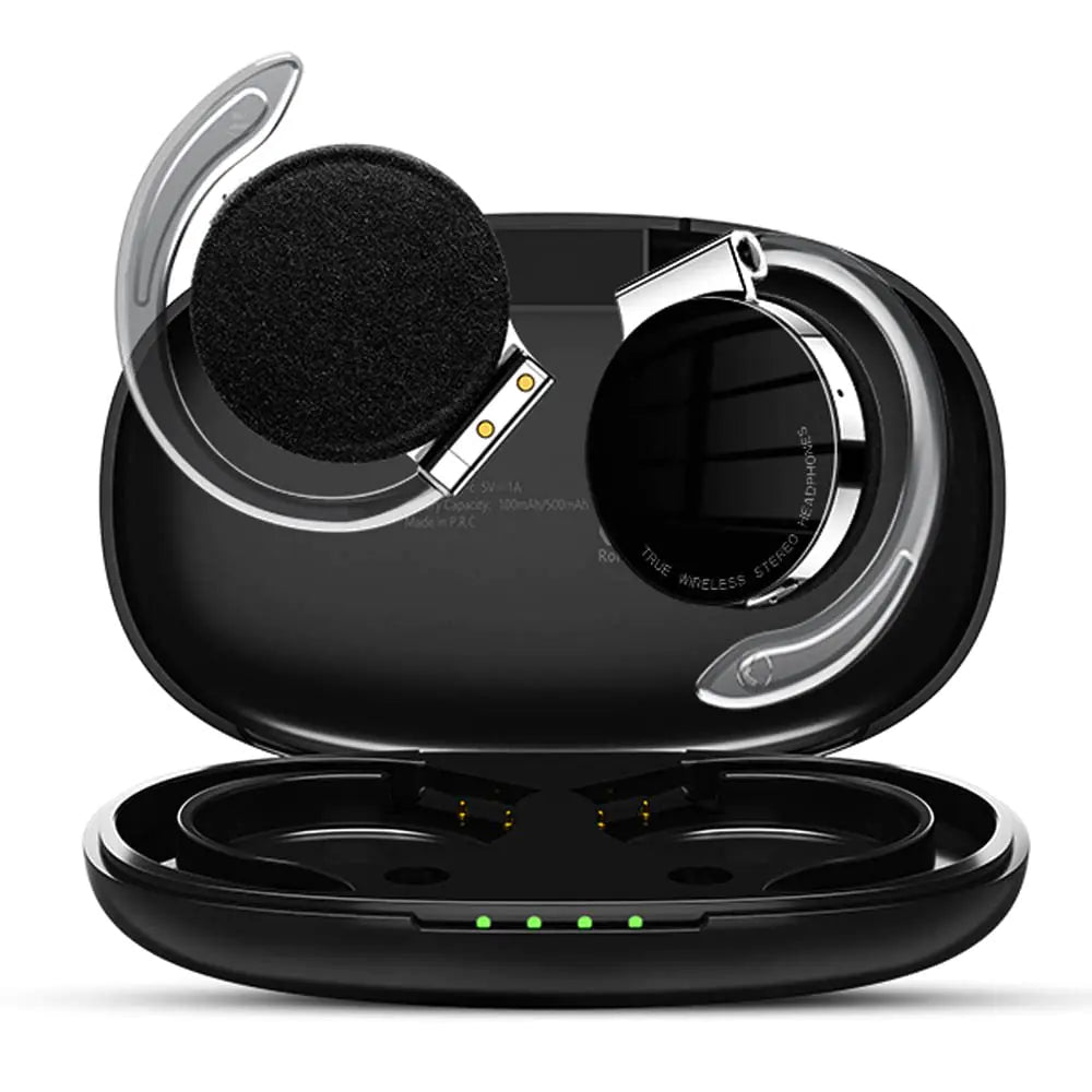 [★ Open Ear Bluetooth Headphones & Air Conduction Headphones★ It can avoid wearing discomfort caused by in-ear or over-ear headphones and keep the inside of the ear canal clean and hygienic you can also hear the outside sound when listening music by this headpahones. This bluetooth headphone come with a 500mAh charge case one time charge can play 8-10 hours 2 earbuds total playing time is about 40 hours ★Auto Pairing & Noise Cancellation Headphones Earbuds ★ When take off the wireless earbuds from charging case it will automatically power on and will automatic pairing the each other. After two earbuds pairing success then can use cellphone bluetooth to connect earbuds. After first tiem bluetooth connection then earbuds will automactically connect with bluetooth after take off the battery case. ★Button Control & Language Change★ Press the button 1 click to pause or play the music 1 click button to answer or shut off the call. left headphone 2 clicks button to decrease volume right headphone 2 clicks button to increase volume. Left headphone 3 clicks for last song right headphone 3 clicks button for next song. 4 clicks button to turn on or off the ear hook light. Language change: cancel or close bluetooth connection then fast click button 2 times the language will be changed. ★28mm Super Large Speaker & Workout Headphones ★ The bluetooth earphones will ensure that you don’t miss any part or component of your music. The heave low bass from the 28mm big speaker is to act your ears to enjoy the great music.The music output is HD stereo audio that will make high class listening enviroment and the sound is very clear without any noise because of noise cancellation technology. ★Free Replacement within 30 days: ★ We will send you one new same product if the earbuds be damaged or not workwhen it arrived orcan not be charged or can not connect with bluetooth or earbuds can not pairing earbuds can not work after used some times]